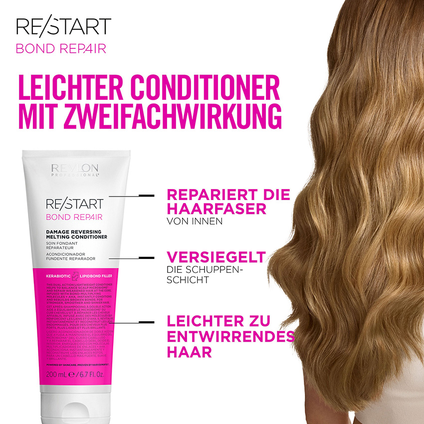 Für ein vollständigeres Reparatursystem kann vor der Haarwäsche das Re/Start Bond Repair Pre-Wash Leave-in Hair Treatment auf das nasse Haar gegeben werden. Revlon empfiehlt dafür eine größere Menge, 5 bis 10 Minuten Einwirkzeit und anschließendes Ausspülen. Danach folgt der Damage Reversing Gentle Cleanser.