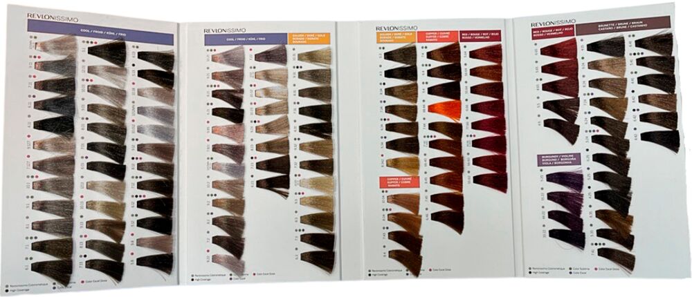 Übersicht aller Nuancen der Revlonissimo Haarfarbe. Die Farbkarte mit Meschen ist perfekt für die Beratung der Kund:innen und bietet zudem alle Informationen zur Anwendung und Einwirkzeiten.
